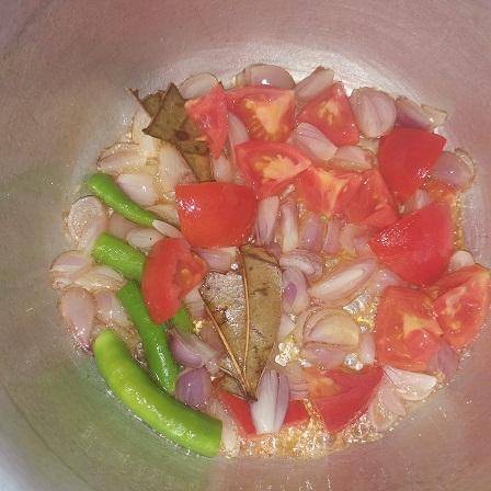 Heat a pan and add oil. Then add chopped onion, tomato, green chilly and biriyani leaf. Fry well.